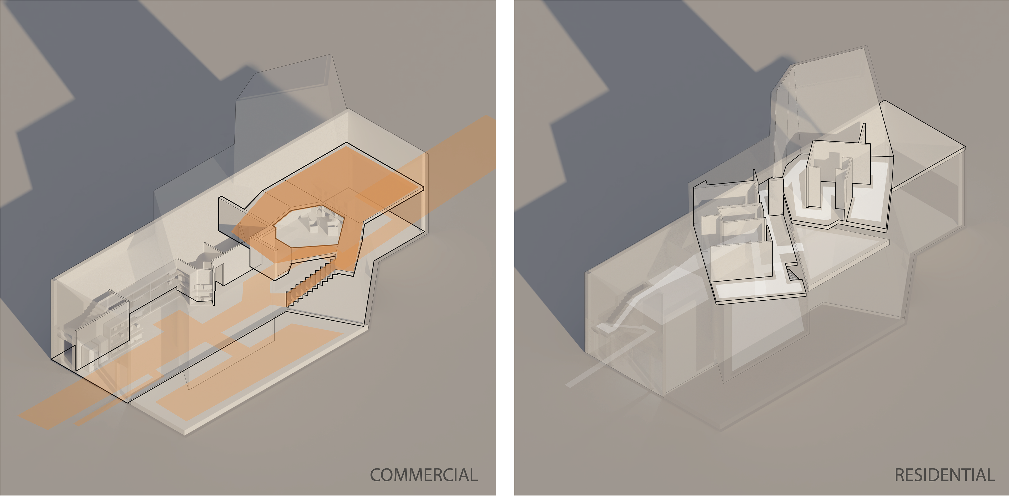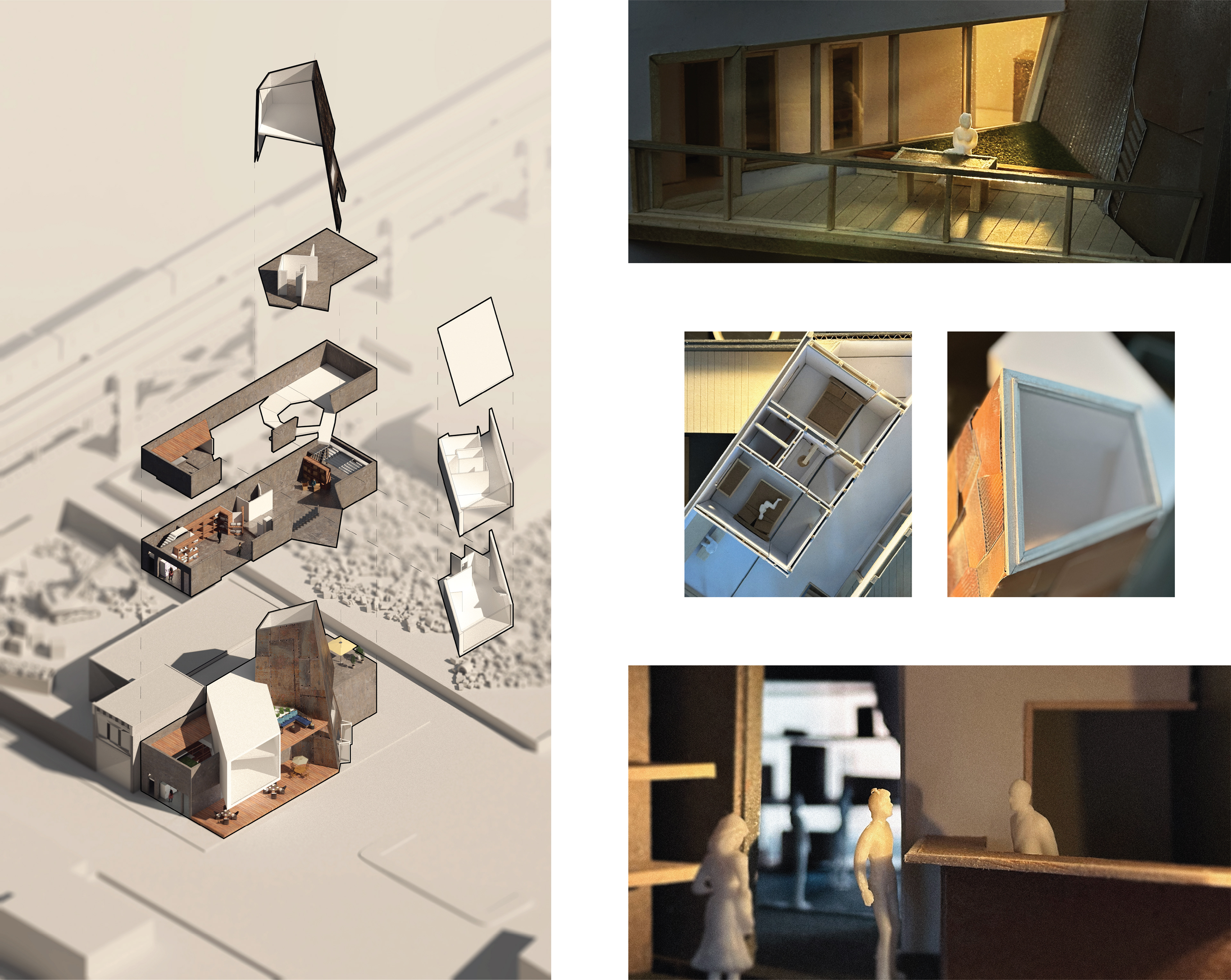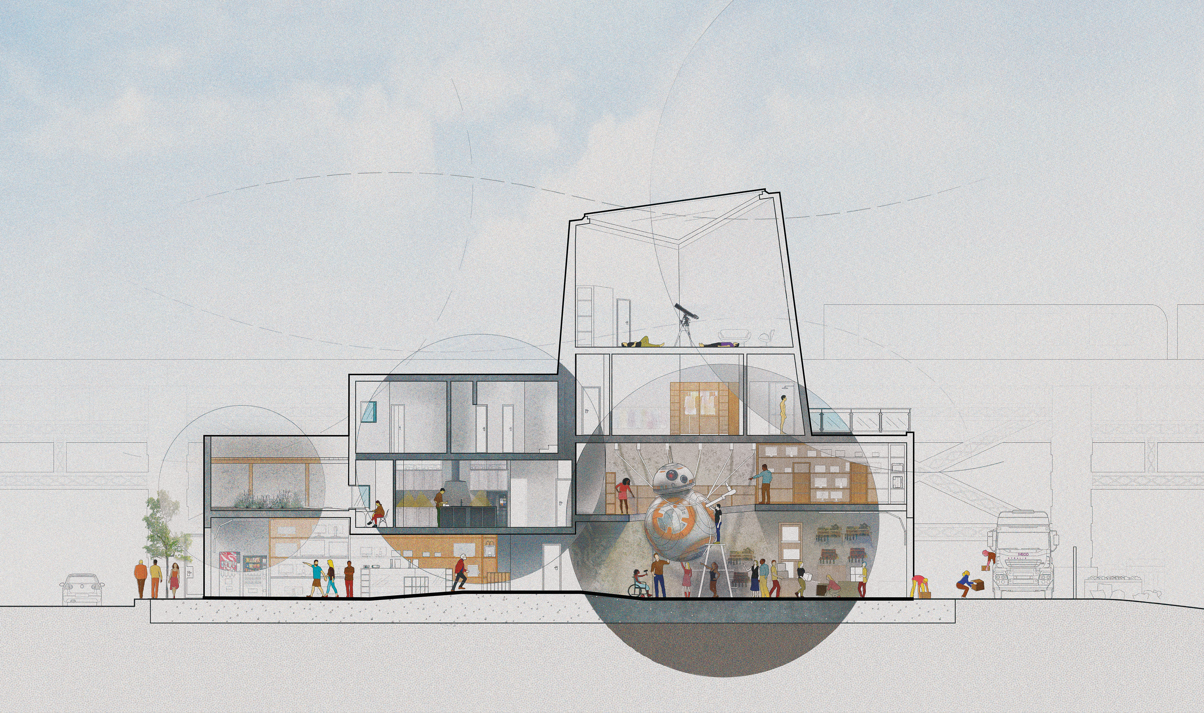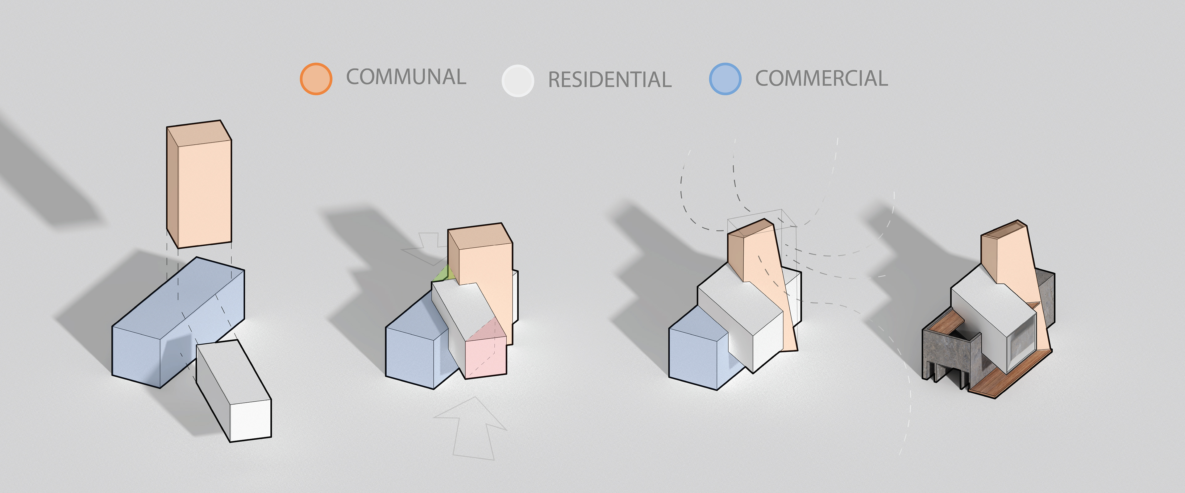 The concrete base anchors the commercial sector whilst the residential mid section is sheared to face the commercial views of Lawrenceville. Lastly the grand spire becomes the grand atrium that withholds a stargazing quiet room and the community workshop. Its sheathing is scavenged from the metal scrapyard adjacent to it.