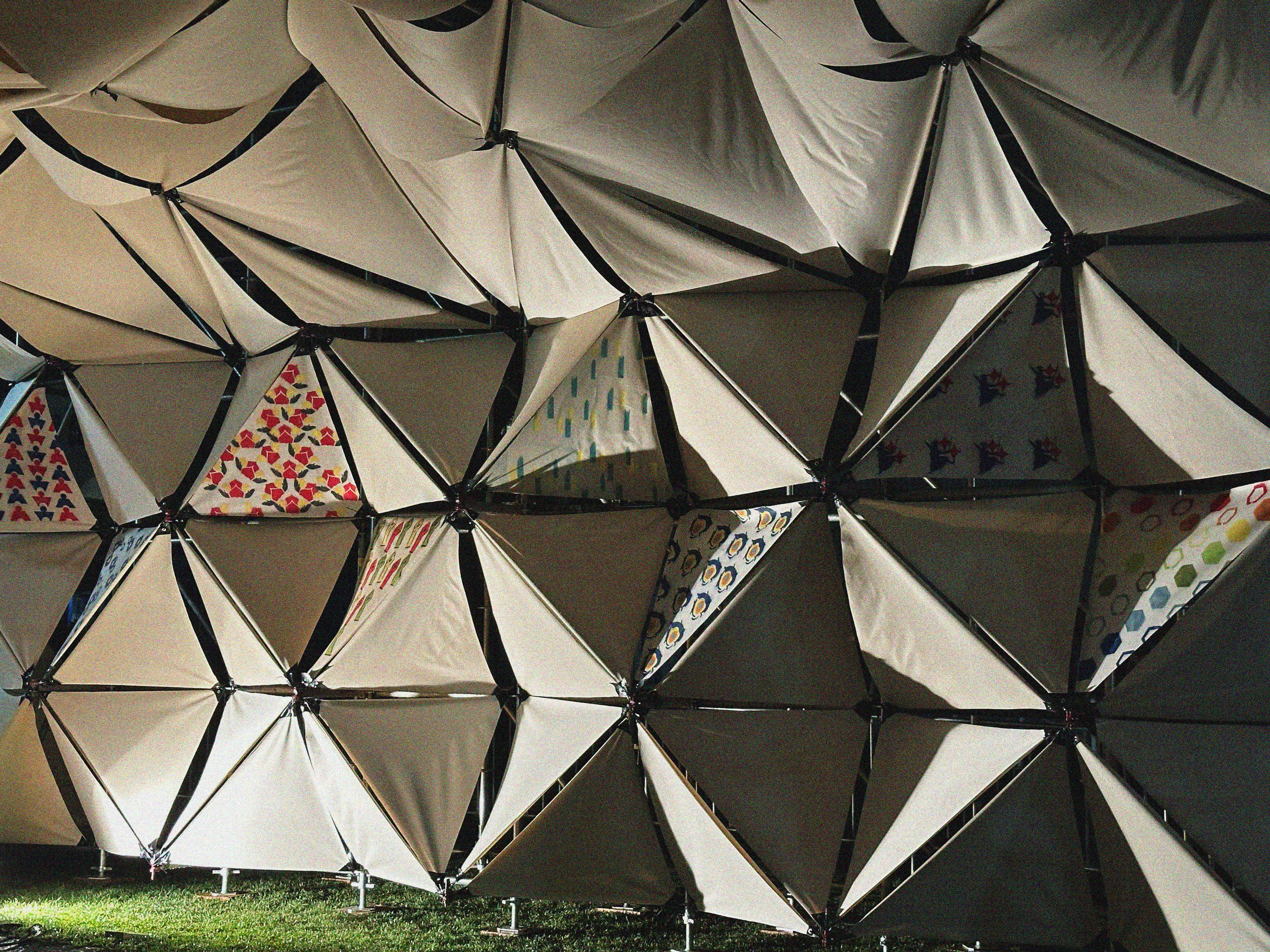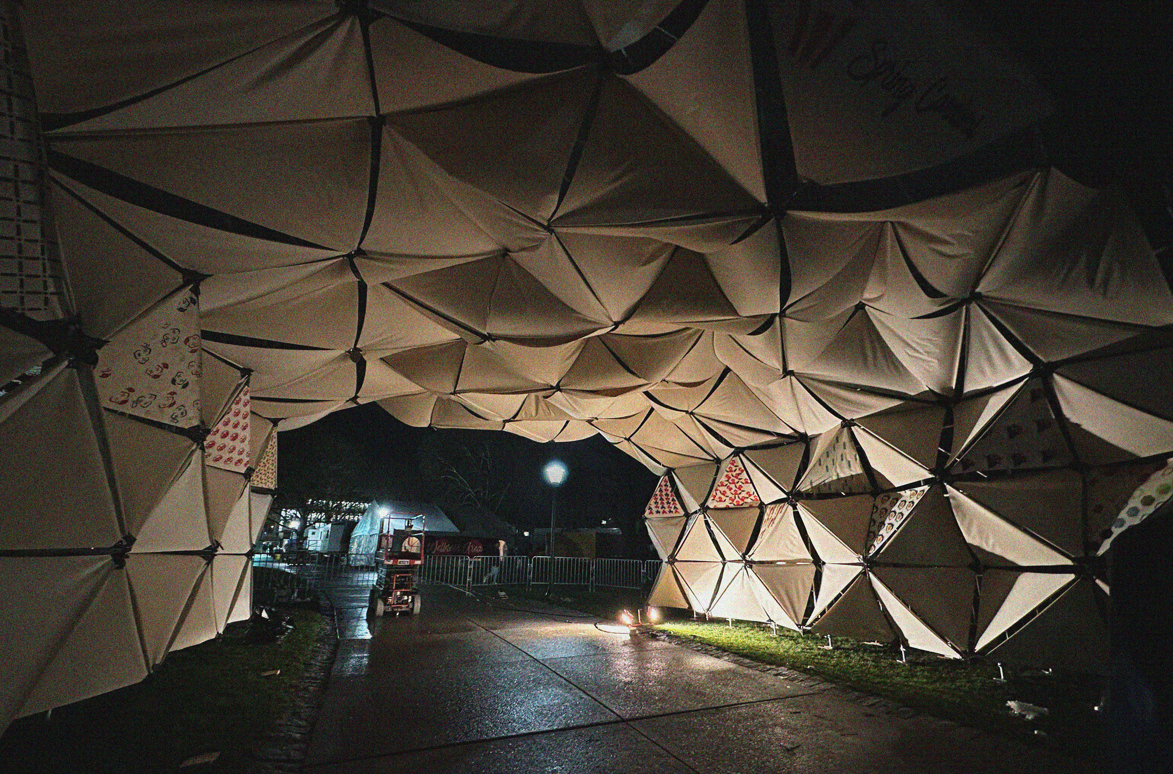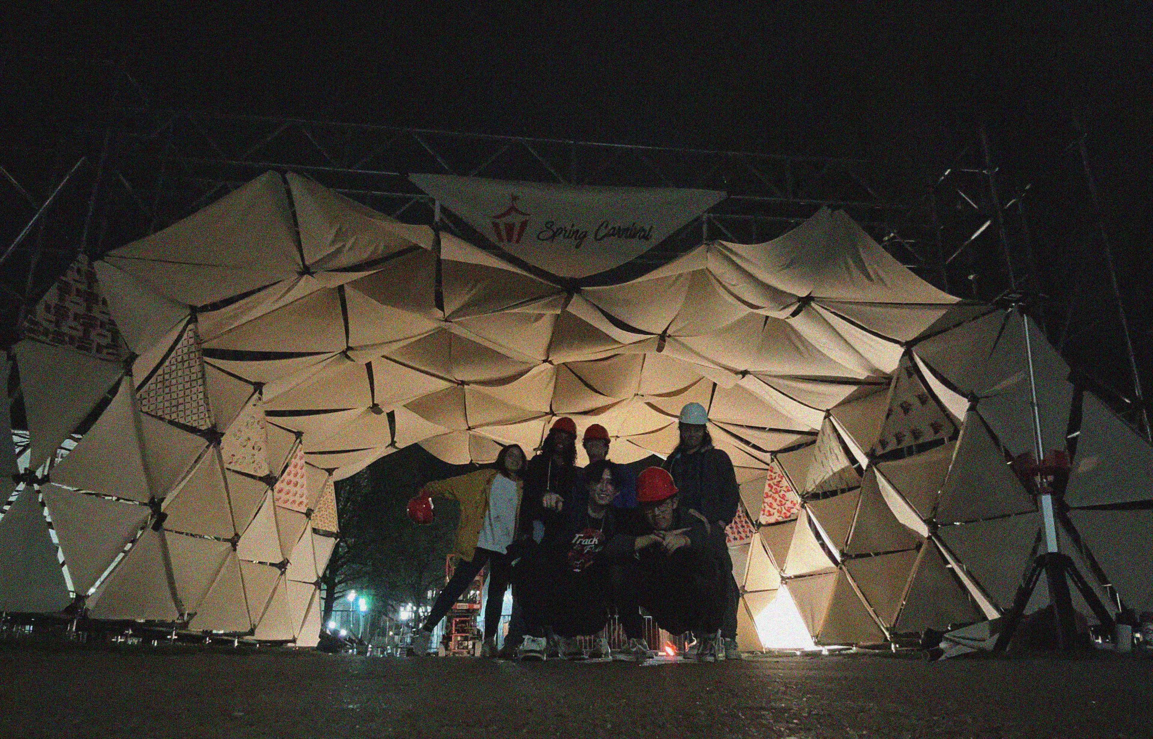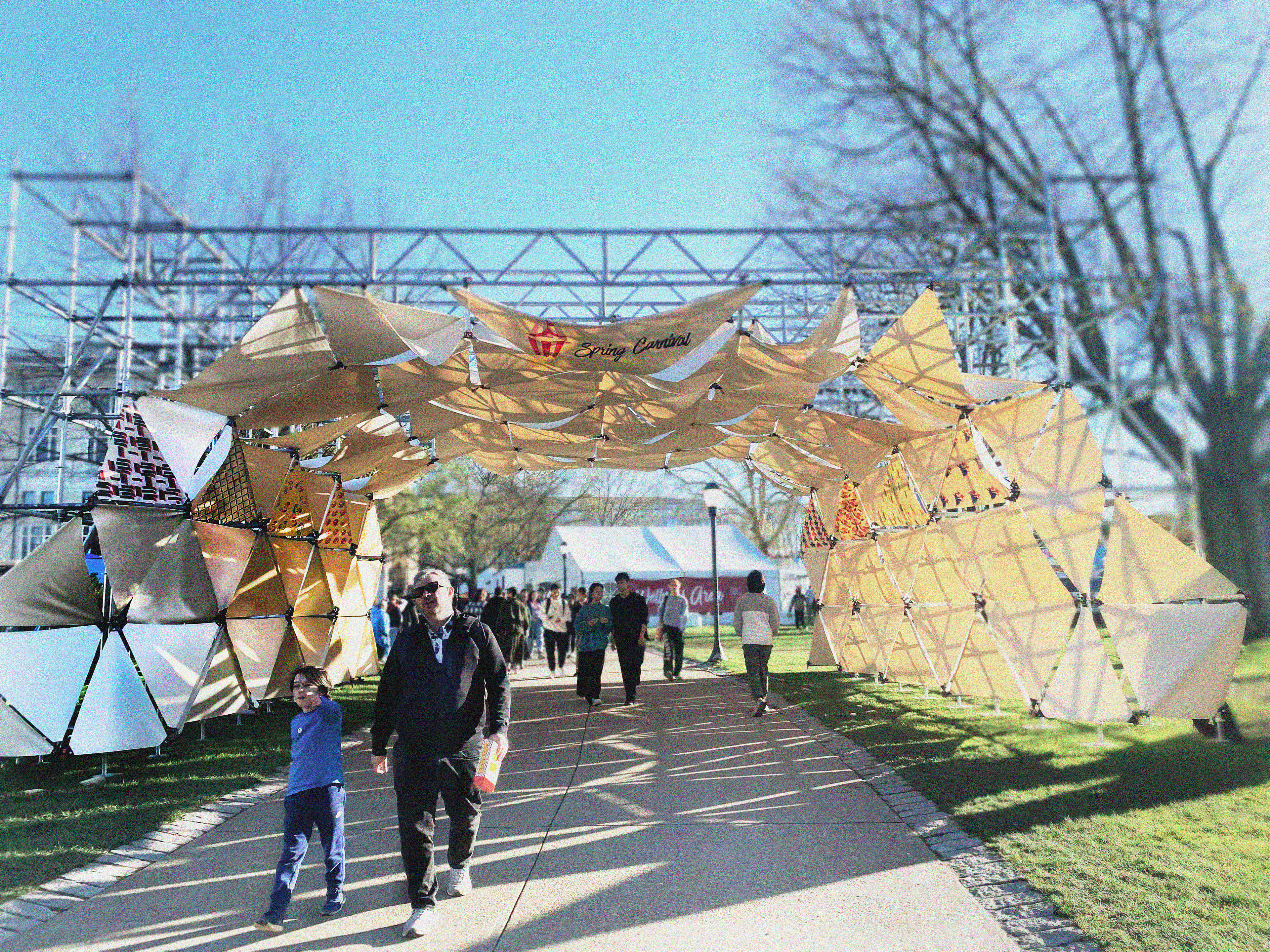 Designed as a temporary public installation, the Spring Carnival Pavilion transforms a structural scaffold system into an interactive communal walkway. A layered facade of hand-painted burlap panels created by minority student organizations wraps the frame, turning the pavilion into a canvas for collective expression and movement. Together, these elements form a vibrant kaleidoscope of cultures that celebrates diversity while minimizing material waste through adaptable, reusable construction.