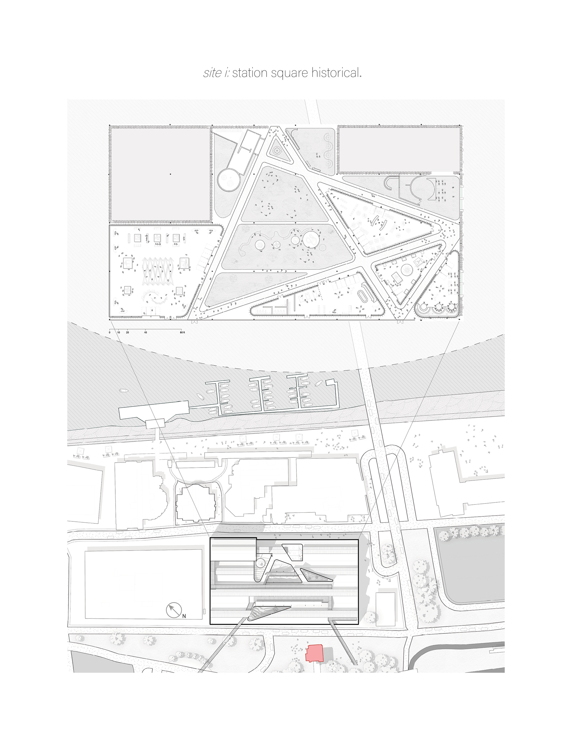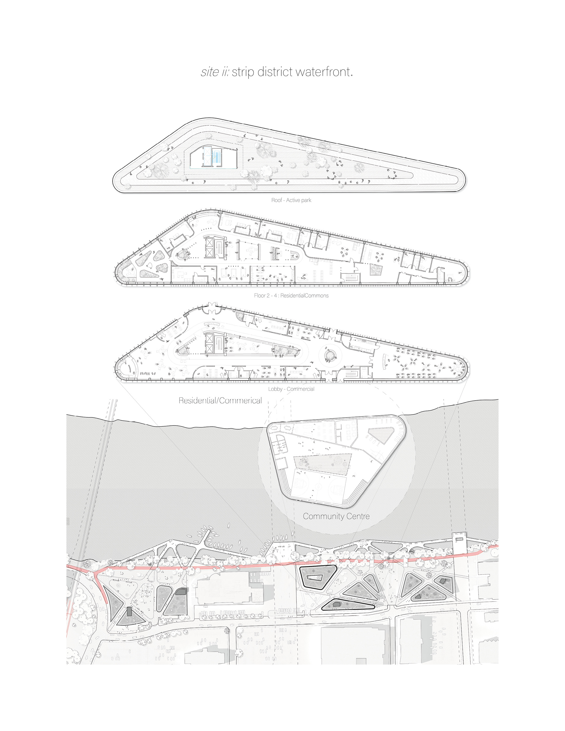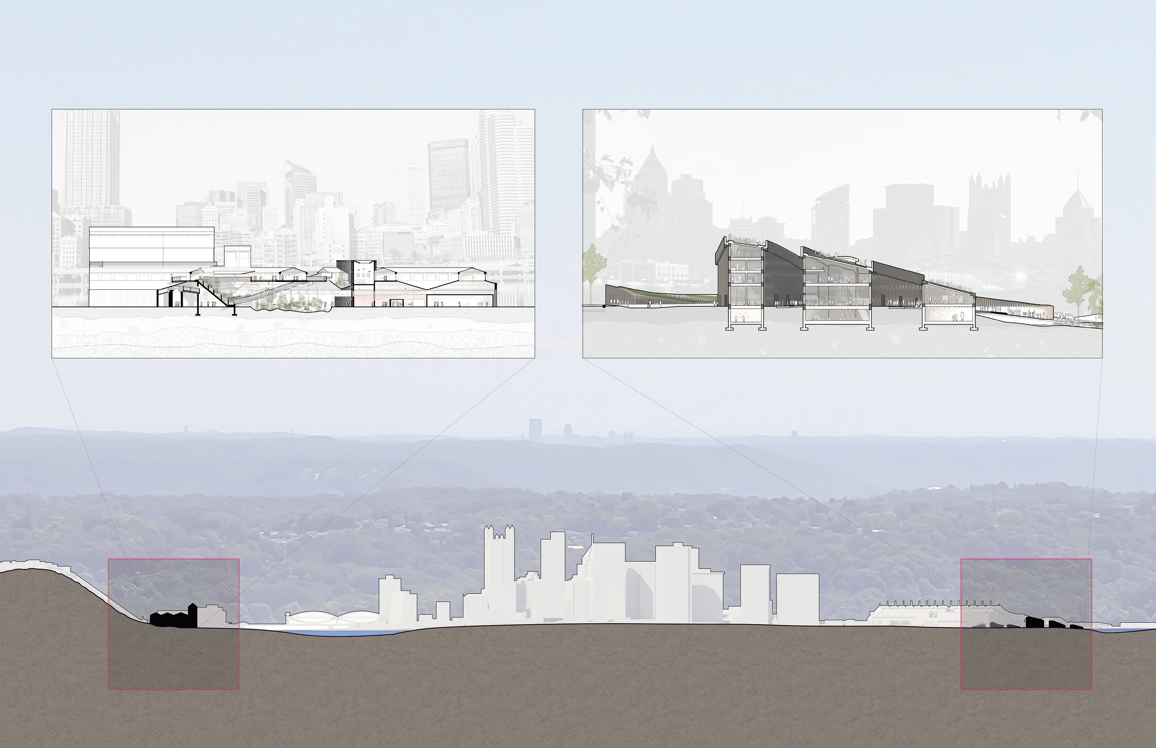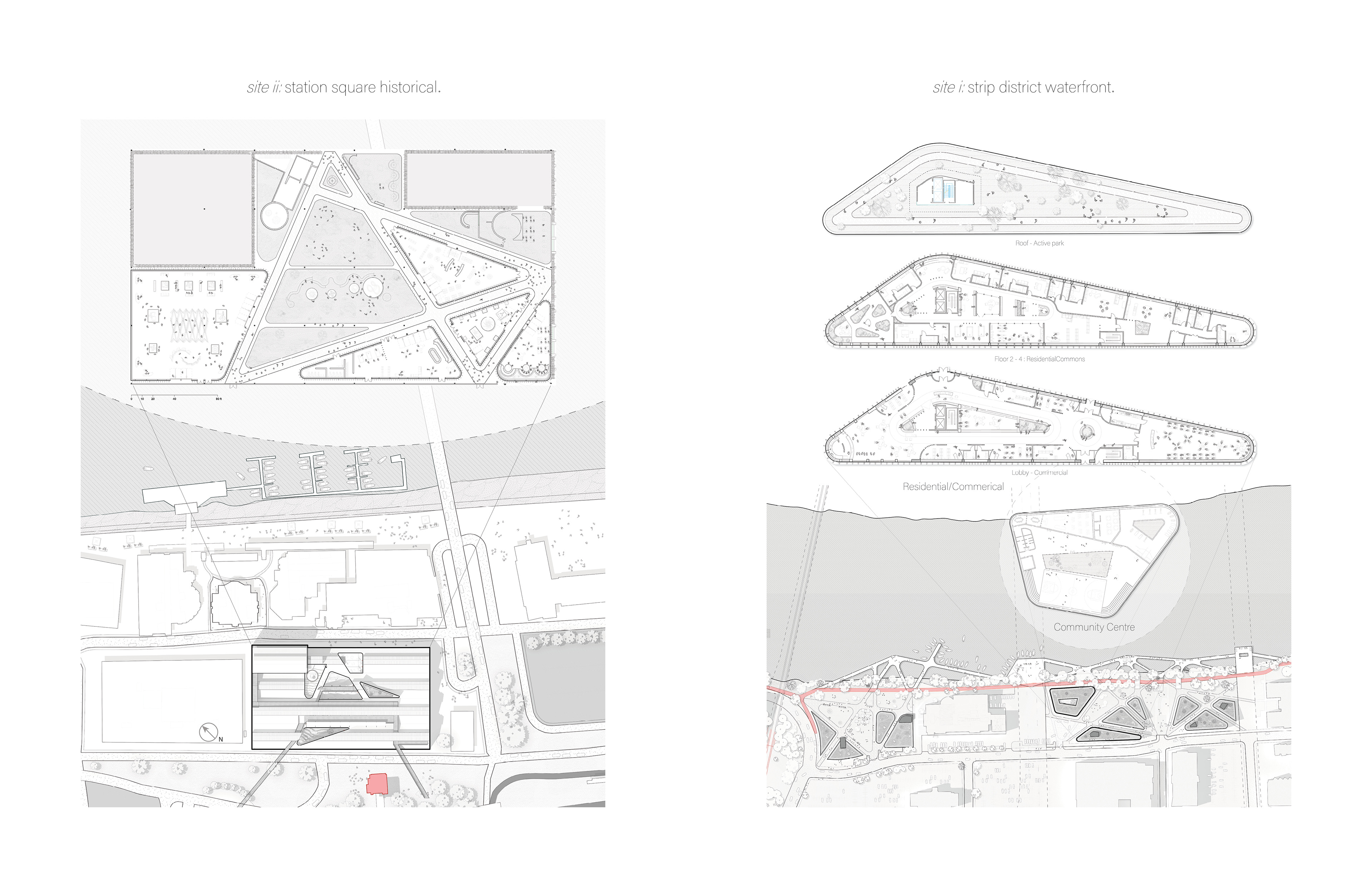 The site matrix highlights both of the sites in the context of Pittsburgh's iconic skyline. The sectional qualities highlights the unique elements of both sites either being the connective pathways between the floors on the historical Station Square site verses the open public gardens between the mixed use residential development on the growing Strip District