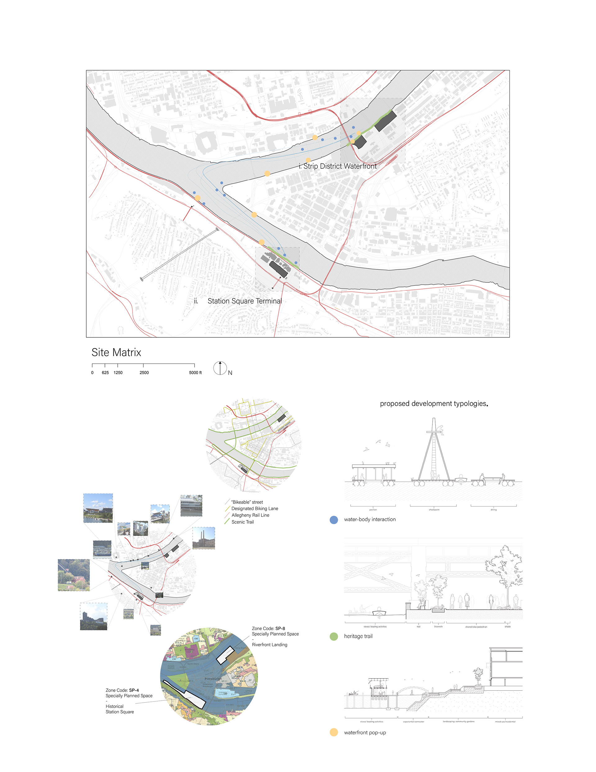Proposed developments are implemented to bring in activity along the waterfront heritage trail in which both sites would be connected by Pittsburgh's tri-river system.